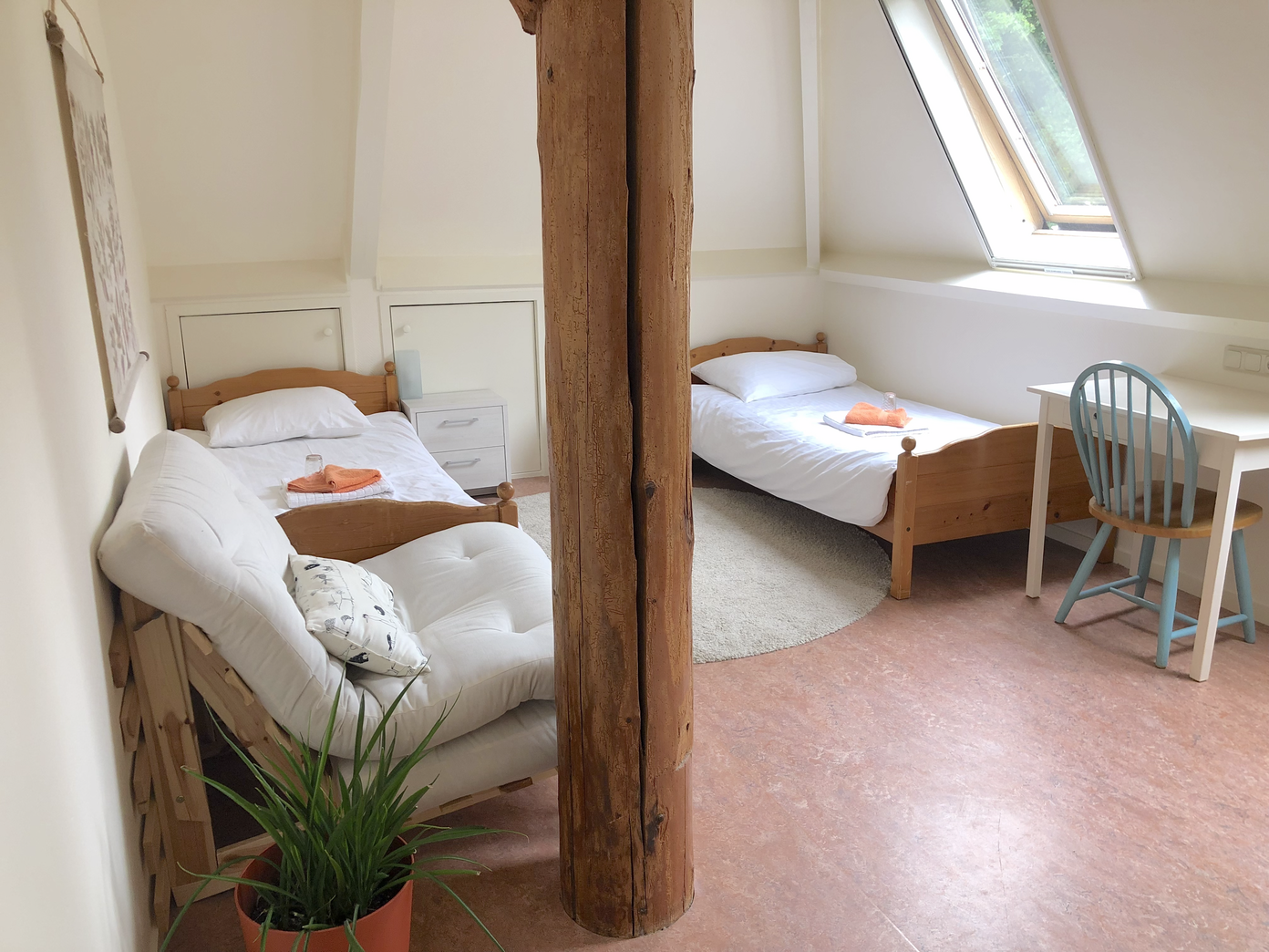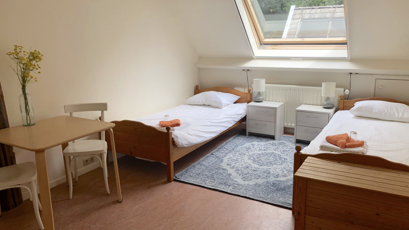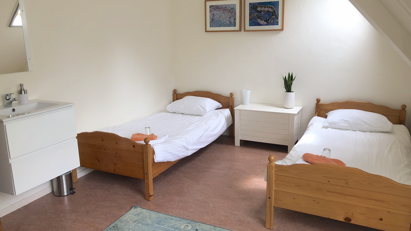 - Upper floor: One private bedroom with two beds and its own en‑suite bathroom (shower + toilet). Adjacent is a cozy attic-style lounge—ideal as a hangout, integration space, or co‑working nook.